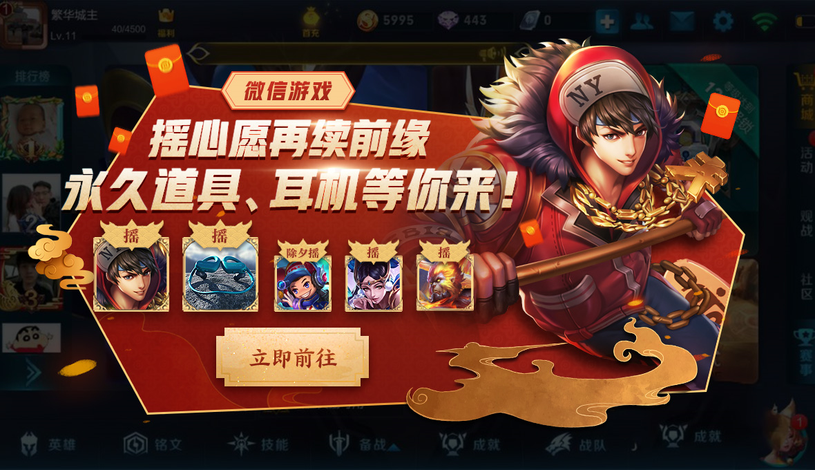 登录游戏即可领取拜年大礼 :新春语音-给您拜年了*1+新春拜年福袋*1(保底288钻石+英雄碎片*5 ,不停峡谷齐聚来拜年。还没参与领取奖励的召唤师们千万别忘记哦!荣耀积分*20/10